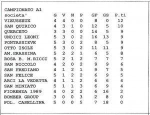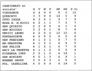 Da segnalare il crescendo del Pontassieve che, avendo già vinto in questa giornata, e’ salito a 12 punti in classifica, mentre hanno un po’ rallentato la loro corsa Otto Isole e Rosa Blu.