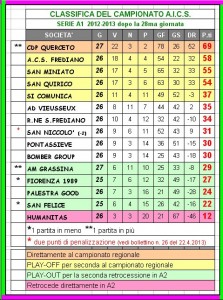 A sole due giornate dal termine del Campionato le posizioni si sono definite in modo abbastanza netto. Giaà acquisita da tempo la vittoria del Querceto, per i play off balzo importante del Si Comunica, che vincendo 3-2 con il Pontassieve, stacca il Vieusseux, bloccato sullo 0-0 dal Grassina ed il Rione SF, a sua volta vittorioso sul san Niccolo’ per 1-0. Nella corsa per evitare i play out sono implicate diverse squadre, sicuramente tutte quelle dai 30 punti in giu’.